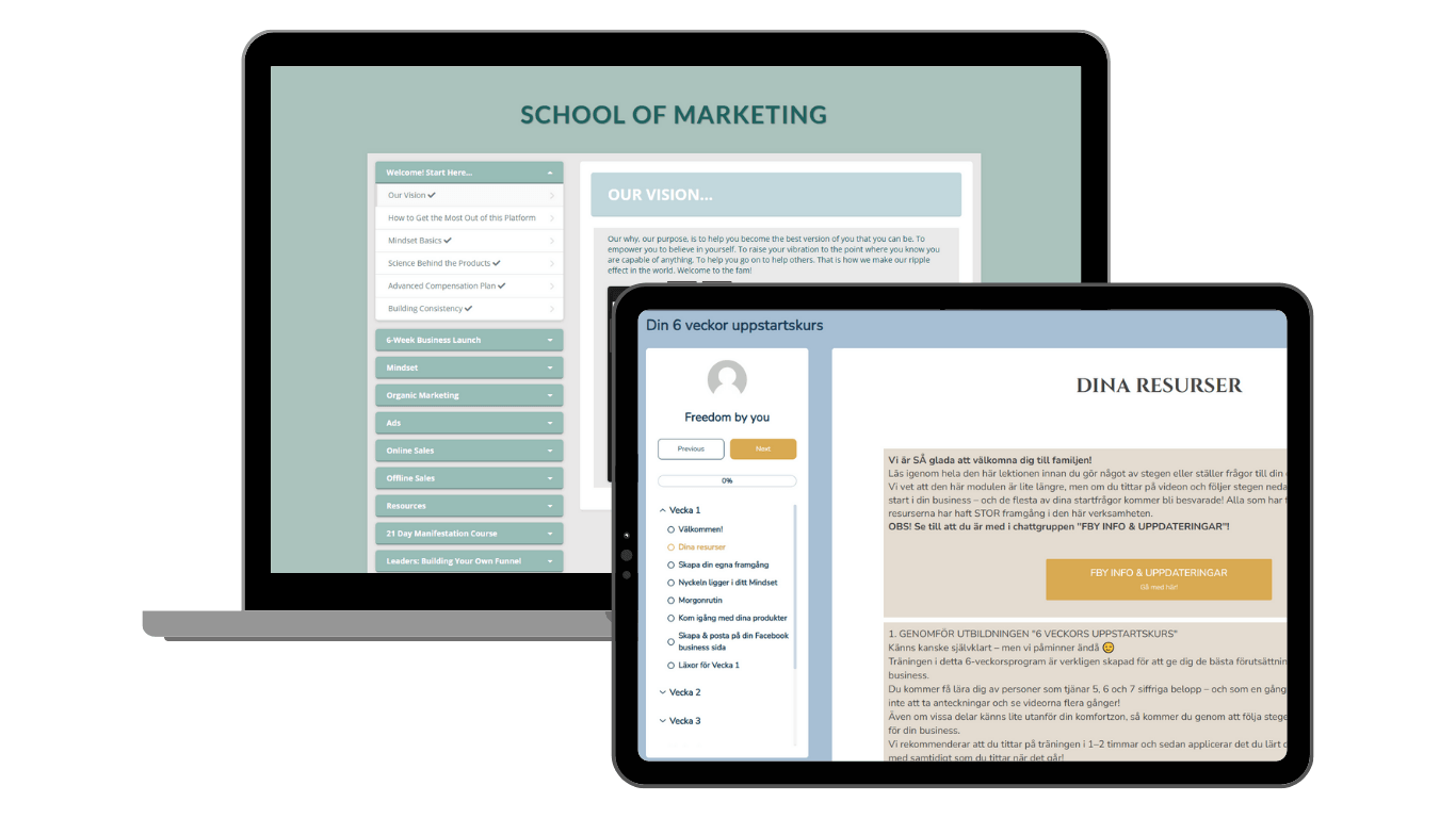 Genom att bli medlem i vårt community får du inte bara tillgång till en färdig Online affiliatemarkerting business modell och en etablerad högvärdesprodukt som du kan sälja oberoende av tid eller plats, du får även en egen mentor, och blir en del av ett community med online entreprenörer och utbildningar.